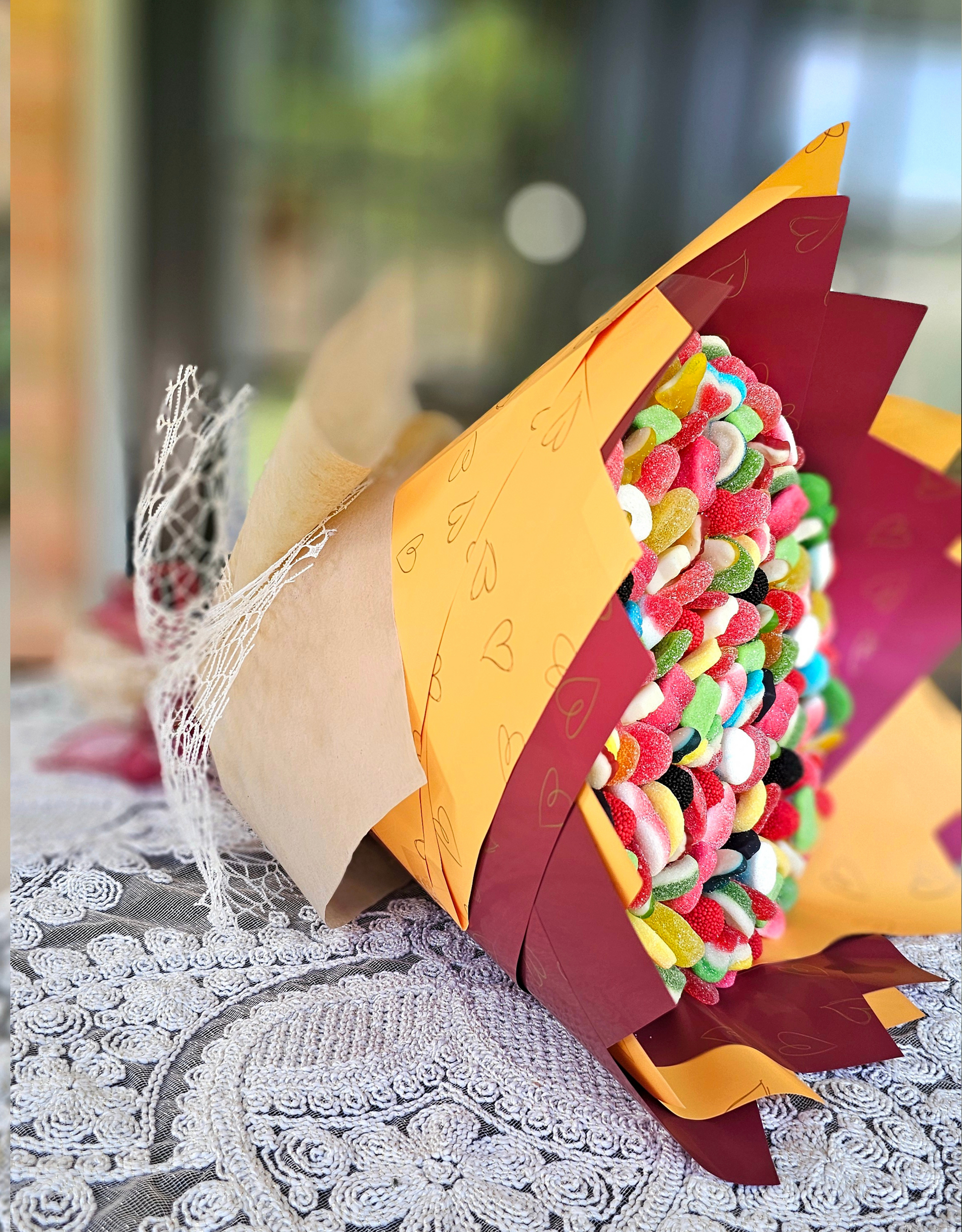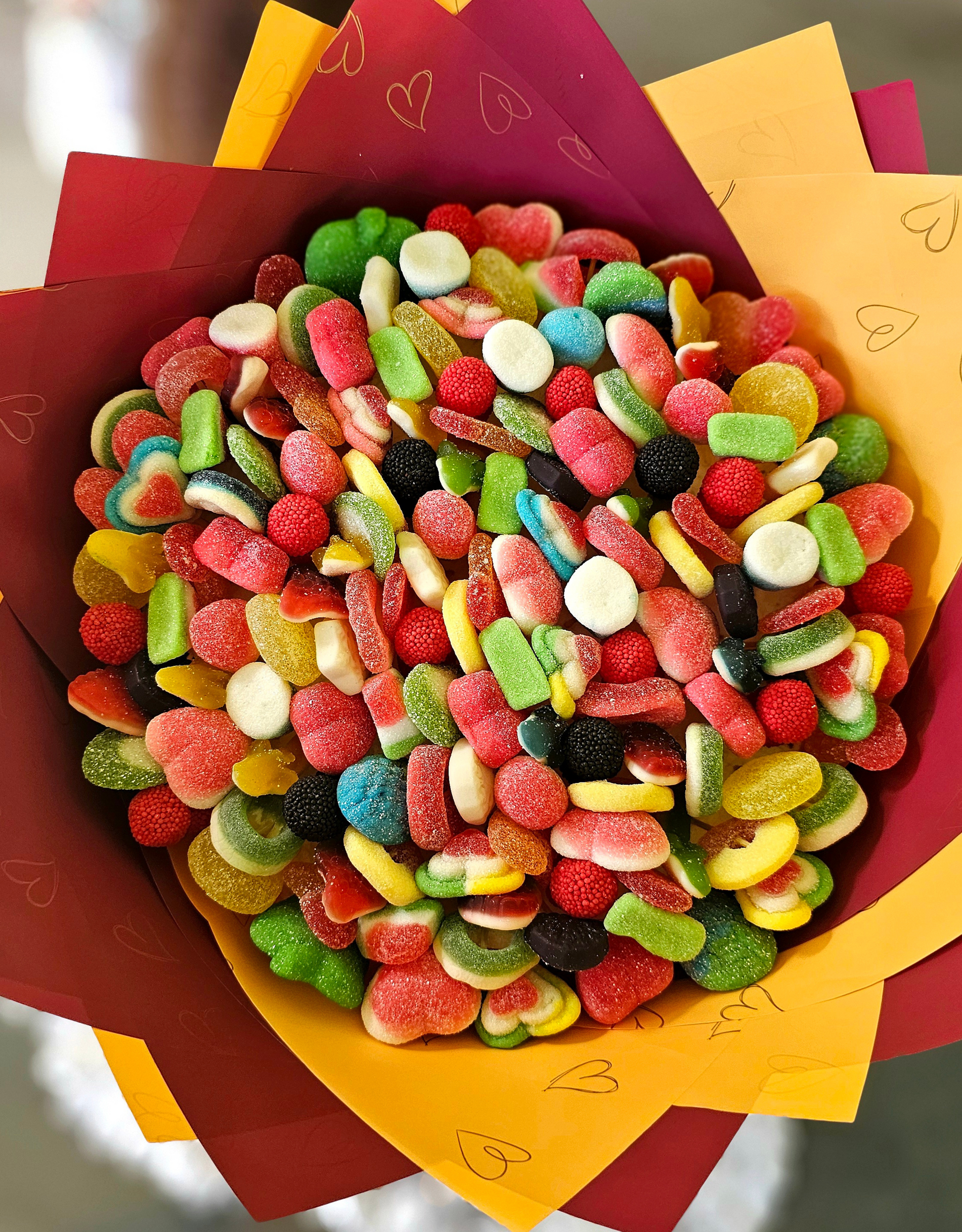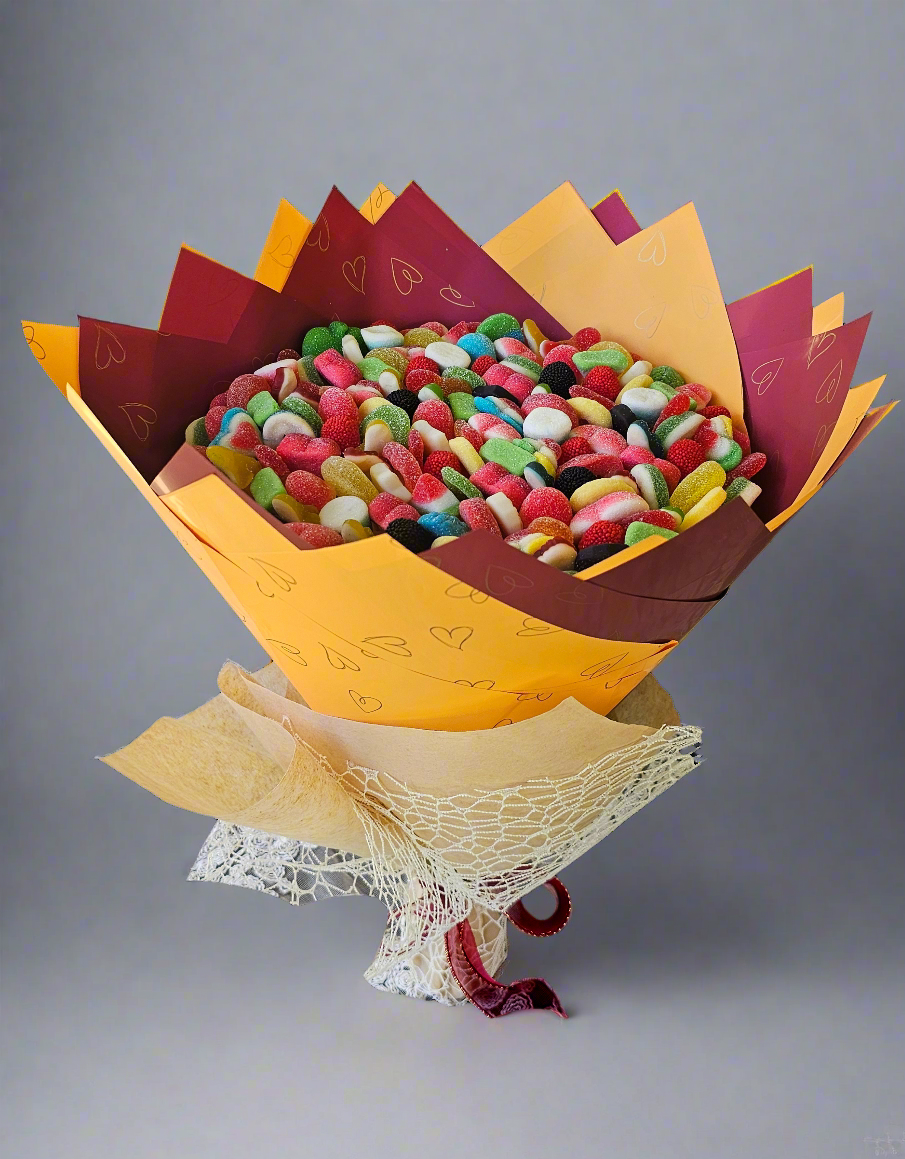 Packed with a colorful explosion of sweet and sour gummy candies, our Berry Burst Candy Bouquet is a festive treat for the senses. From tangy belts to juicy hearts and chewy bites, every layer is thoughtfully arranged to create a bouquet that’s as stunning as it is delicious. Wrapped in rich shades of maroon and orange with heart detailing, it’s the perfect gift to add a pop of flavor and joy to any celebration. Edible Arrangements